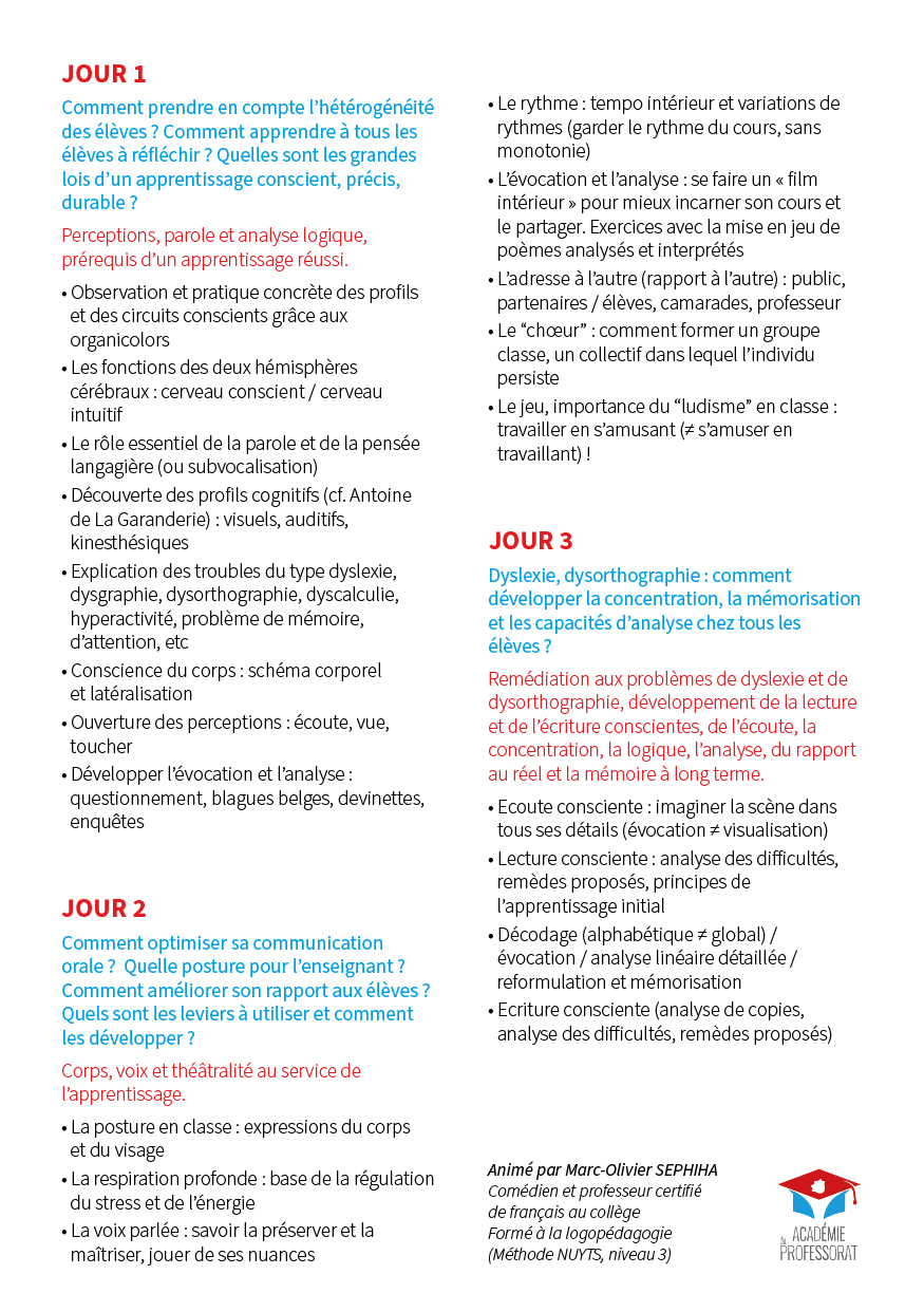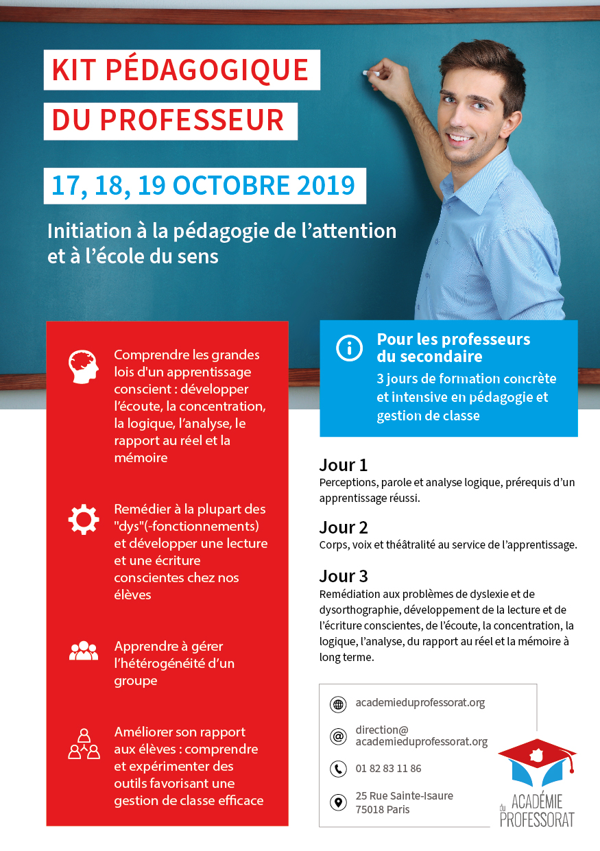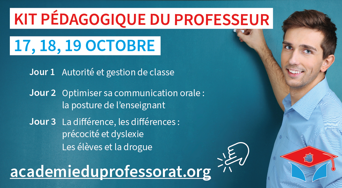 le ‘Kit pédagogique » de l’Académie du professorat a été reconduit pour les vacances de la Toussaint (du 17 au 19 octobre), les sessions d’été ayant affiché complet : on mesure combien le besoin des professeurs à recevoir une formation en pédagogie et en gestion de classe est grand !